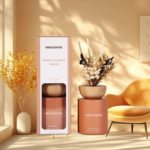 Mescente ก้านกกกกตัวกระจายกลิ่นกลิ่นพร้อมฝาไม้120มล. หรูหราสั่งทำฉลากส่วนตัวได้ตามต้องการ